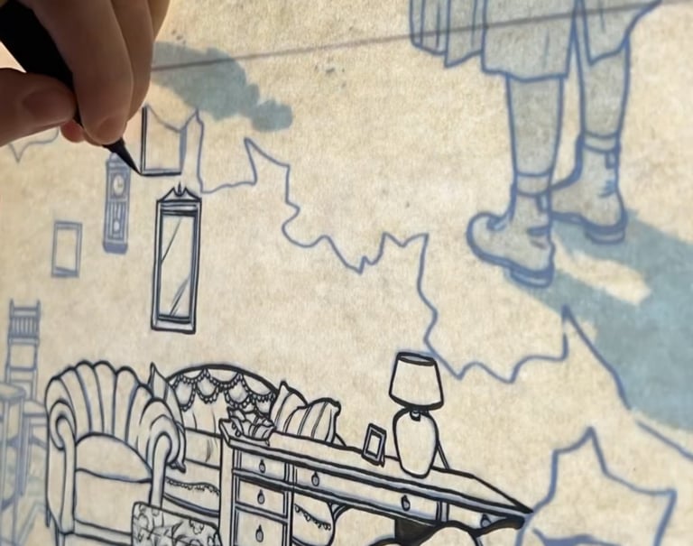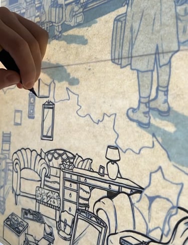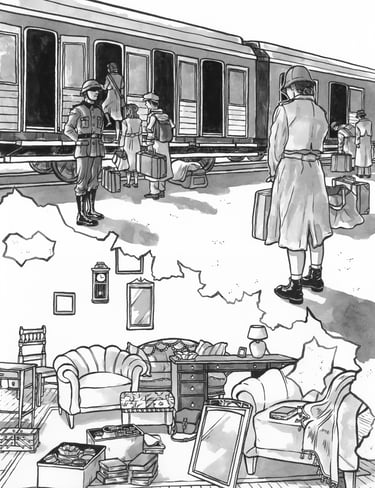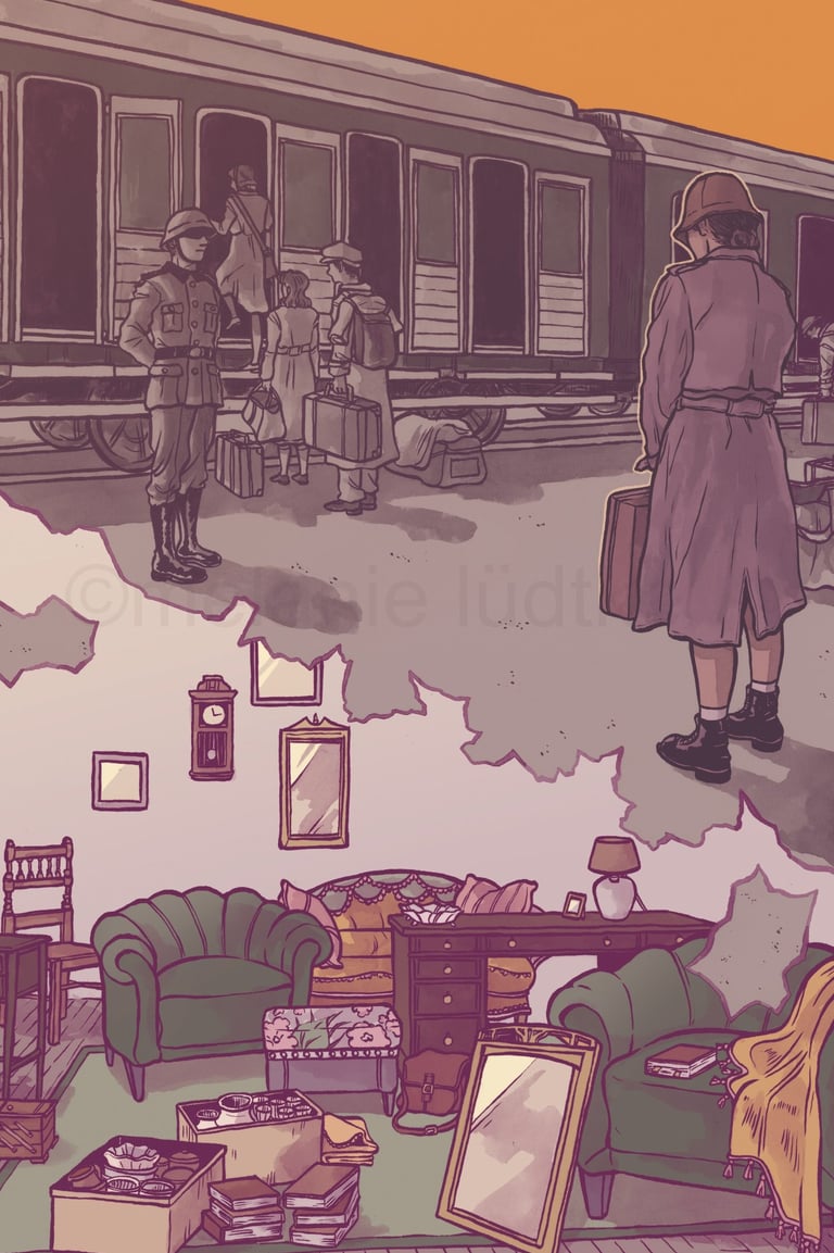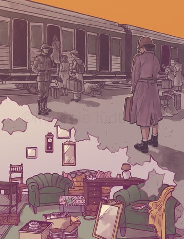 Diese Illustration ist in Zusammenarbeit mit dem Landschaftsverbands Südniedersachsen e. V. und der Zentralen Kustodie/dem Forum Wissen der Georg-August-Universität Göttingen entstanden für das Projekt "Nachgefragt – vor Ort". In der Stadt Alfeld fand die erste Ausstellung im September 24 statt mit einer Installation aus Alltagsgegenständen. Die Illustration diente zur Visualisierung der dort gezeigten Dokumentation "Fragl. Herkunft – Ein Film über Provenienzforschung in Südniedersachsen" von Janek Totaro, Johannes Kohout & Christian Riemenschneider. In diesem Film wird in einem Abschnitt das Leben der jüdischen Familie Plaut behandelt. Die Illustration sollte die Geschichte dieser Familie während der NS-Zeit greifbarer machen.