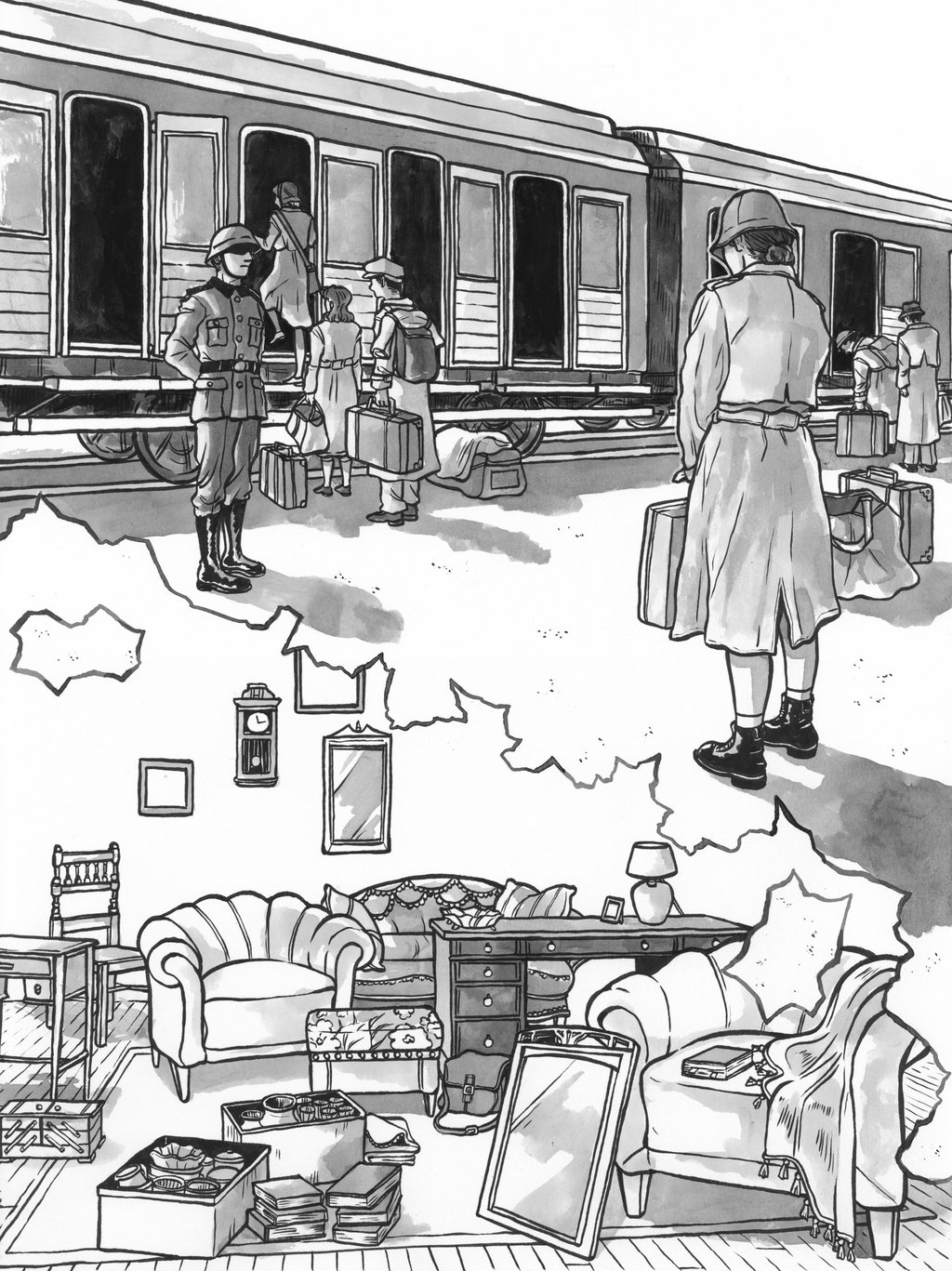 In der Illustation zu sehen ist Klara Plaut, die kurz davor ist den Deportationszug zu betreten. Im Kontrast zu dieser Szene sind die Besitztümer der Familie zu sehen, welche nach der Deportation versteigert wurden.