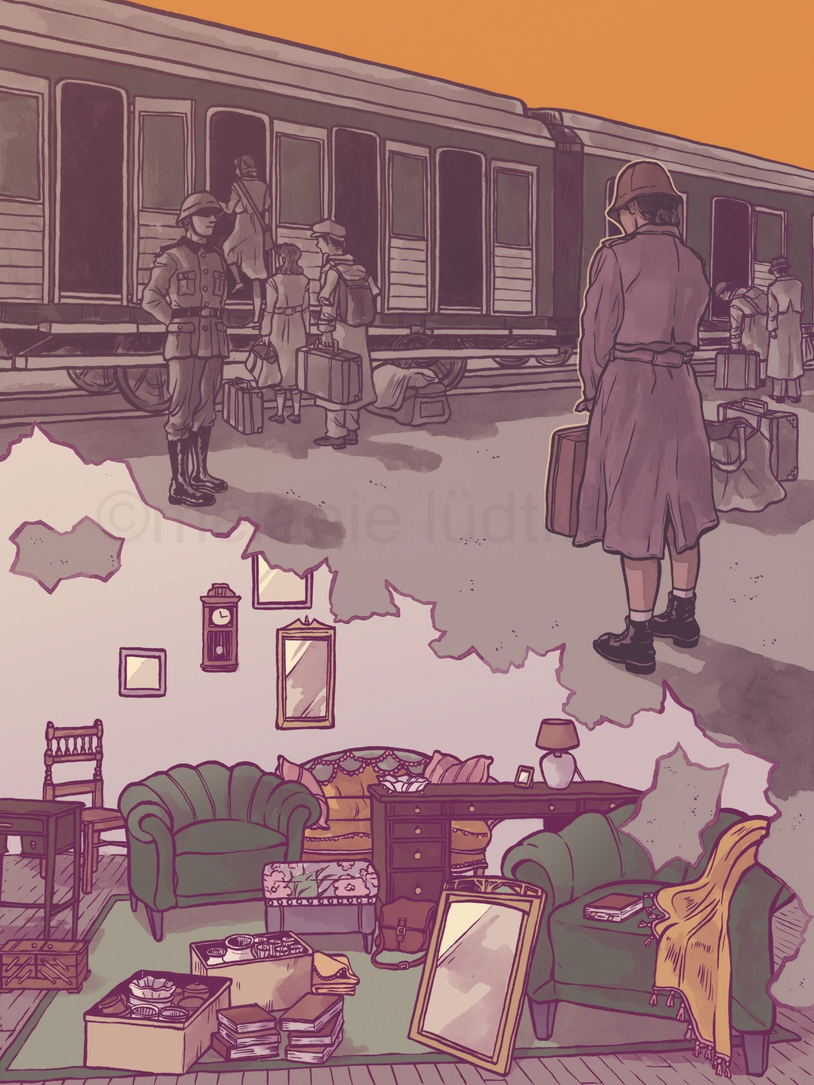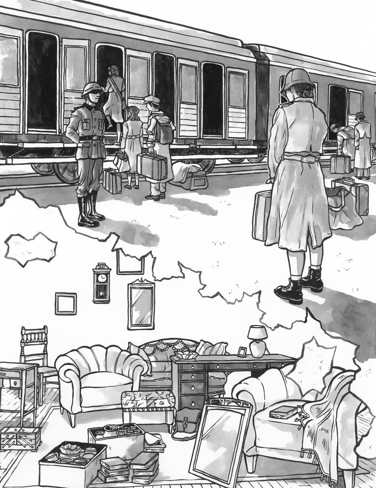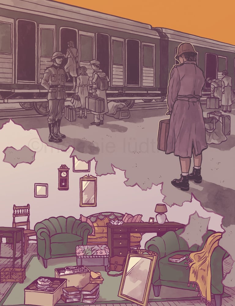Diese Illustration ist in Zusammenarbeit mit dem Landschaftsverbands Südniedersachsen e. V. und der Zentralen Kustodie/dem Forum Wissen der Georg-August-Universität Göttingen entstanden für das Projekt "Nachgefragt – vor Ort". In der Stadt Alfeld fand die erste Ausstellung im September 24 statt mit einer Installation aus Alltagsgegenständen. Die Illustration diente zur Visualisierung der dort gezeigten Dokumentation "Fragl. Herkunft – Ein Film über Provenienzforschung in Südniedersachsen" von Janek Totaro, Johannes Kohout & Christian Riemenschneider. In diesem Film wird in einem Abschnitt das Leben der jüdischen Familie Plaut behandelt. Die Illustration sollte die Geschichte dieser Familie während der NS-Zeit greifbarer machen.